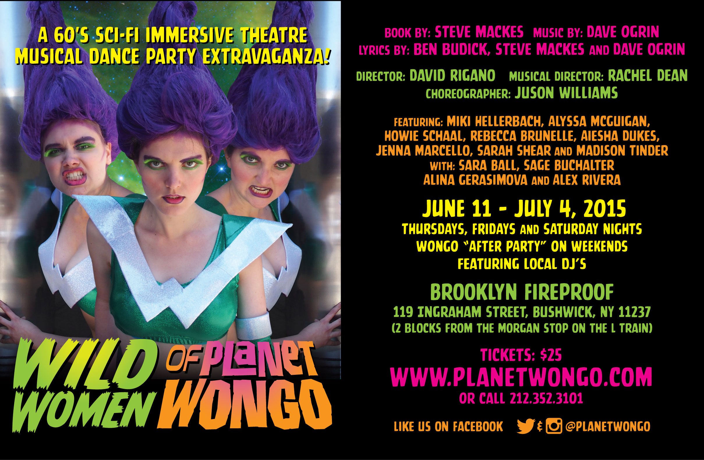 From Yiddishkeit to Wongolite…composer Dave Ogrin has taken his wonderful Wild Women of Planet Wongo which originally was presented in a classic theatrical setting and moved it to the outer galaxy of Bushwick for a cosmic immersive experience in space. With the feel of a 60’s B movie, two astronauts, delivering CheesyMoon Crater Chips to hungry space stations, find themselves after three long years on a planet in habited only by women. Though hesitant at first, the captain finally joins his crewmate in tasting the delicacies of the Wongo Flesh, in his case, the Queen. But sex isn’t the only thing the Wongettes have in mind…they are also starved –and have very different plans for their male guests.