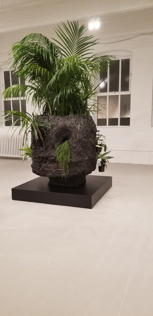 There is also a living sculpture in the middle room. It is a black trunk like base which houses many different types of green plants, each emerging from its own secret space’ perhaps a reminder of how life forms can live with each other, separate, but still united in the comfort of its home base.