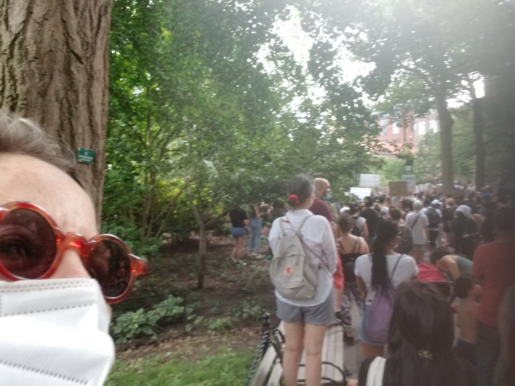 Earlier, I carefully stood at the circumference of a demonstration in Washington Square Park and felt the beginnings of a sense of community. My friends who had been to same demonstration later noticed that very few of the police people were wearing masks and my pal courageously asked one of the cops,” why not?” His response wasn’t very polite–it’s disappointing because I, too, have seen very few masks on men in blue. But beyond that hitch, it was peaceful. My neighborhood art center PS122, is set up with a protestor crib center, a place to refresh, get safety supplies, chat and eat. They are well organized and welcoming.