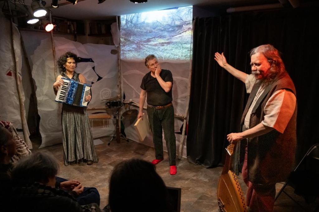 Time is a theme here…David Burliuk, Ukranian born and the subject of the show, was a painter, poet and organizer of the movement called Futurism, performing through Europe, Siberia and Japan, before landing in New York in 1922. He is interpreted by the great poet impresario, Bob Holman of Bowery Poetry Club fame, lending a little W.C. Fields to the madness of this strange and wonderful show. His co-horts on stage include Susan Hwang, as a Scythian goddess and viper, playing so many stringed instruments, you cannot keep count. On stage is narrator Julian Kytasty with his beautiful impregnated lute, the bandura. He keeps the story moving along as Burliuk travels the steppes of time in pursuit of something, though one is never quite sure what that is.